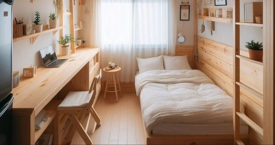 Với diện tích siêu nhỏ 2m², việc chọn nội thất thông minh là yếu tố quyết định. Giường kéo kết hợp tủ quần áo và bàn học gấp gọn là lựa chọn lý tưởng.